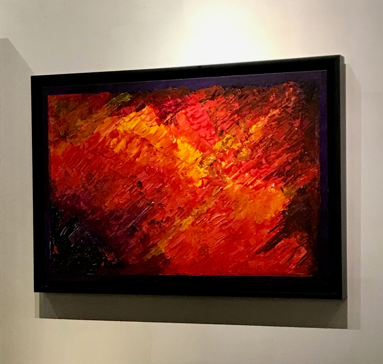 This is a Tony Hammer abstract acrylic painting for your home or office. This piece has a striking and energetic movement aesthetic. The colors streak and overlap, while also being contrasted by subtle color shifts, lines and patterns. The accents of purple, yellow, orange and red are energetic and striking. Fragments of neutral and bright colors streak and breeze across the surface creating a unique overall piece. It is truly an abstract painting like no other that will enhance your space.