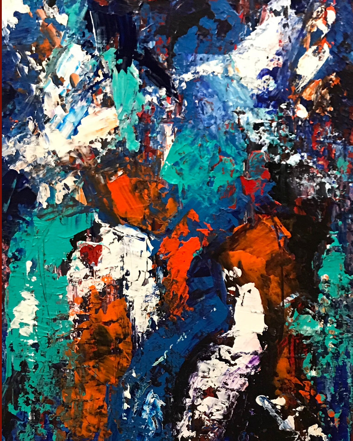 The abstract acrylic painting features a striking criss-cross design aesthetic, showcasing a powerful interplay of colors, lines, and patterns. The bold hues of red, orange, blue, and white are masterfully contrasted with subtle color shifts, creating a dynamic visual experience. Neutral and bright colors sweep across the canvas, lending a sense of movement and energy to the piece.