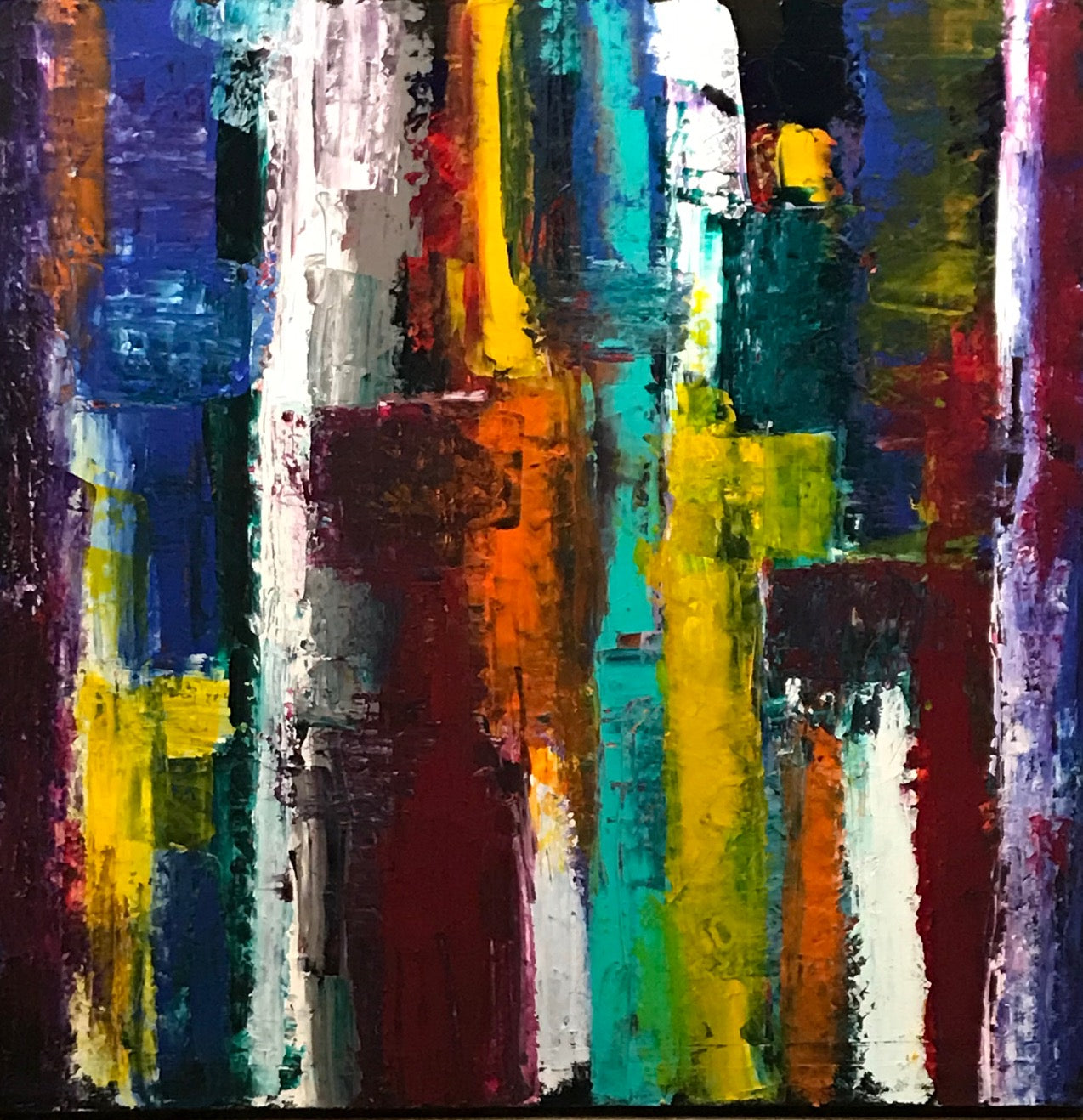 This is a Tony Hammer abstract acrylic painting for your home or office. This piece has a powerful descending colorful design aesthetic. The colors streak and overlap, while also being contrasted by subtle color shifts, lines and patterns. The accents of black, yellow, magenta, white and purple is both muted and striking. Fragments of neutral and bright colors streak vertically and breeze across the surface creating a unique overall piece. It is truly an abstract painting like no other that will enhance your space.