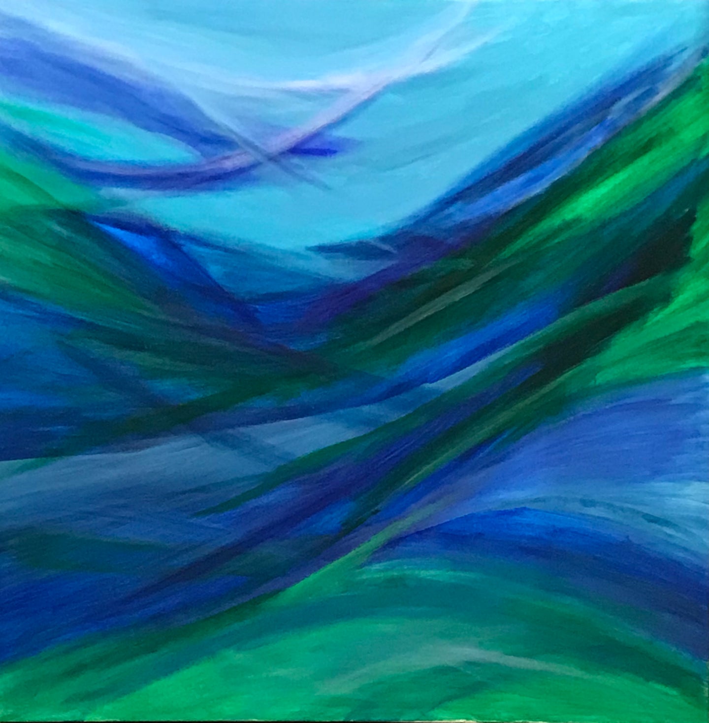 This is a Tony Hammer signed limited edition on canvas for your home or office. This piece has an very soothing and subtle colorful aesthetic. The colors streak and overlap, while also being contrasted by subtle color shifts, lines and patterns. The colors of and shades of blue, and green are flowing. Fragments of neutral and bright colors streak and breeze across the surface creating a unique overall piece. It is truly an abstract painting like no other that will enhance your space.