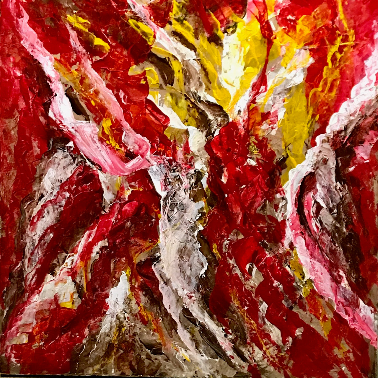 This is a Tony Hammer abstract acrylic painting for your home or office. This piece has a powerful and energetic movement aesthetic. The colors streak and overlap, while also being contrasted by subtle color shifts, lines and patterns. The colors of red, yellow, white and brown is both intense and striking. Fragments of neutral and bright colors streak and breeze across the surface creating a unique overall piece. It is truly an abstract painting like no other that will enhance your space.