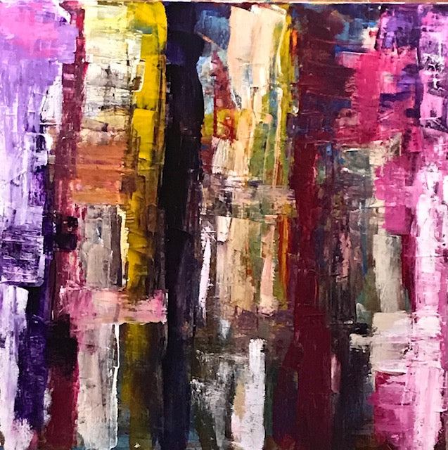 This is a Tony Hammer abstract acrylic painting for your home or office. This piece has a faded design aesthetic. The colors streak and overlap, while also being contrasted by subtle color shifts, lines and patterns. The accents of black, yellow and purple is both muted and striking. Fragments of neutral and bright colors streak and breeze across the surface creating a unique overall piece. It is truly an abstract painting like no other that will enhance your space.