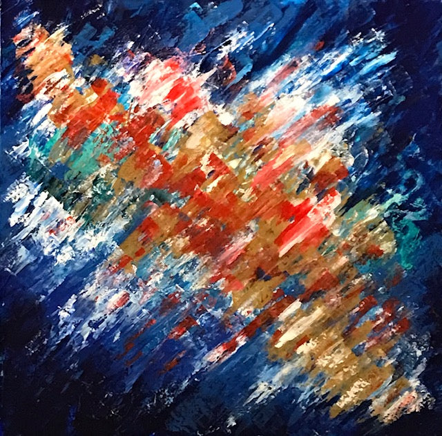 This is a Tony Hammer abstract acrylic painting for your home or office. This piece has a whirling design aesthetic. The colors streak and overlap, while also being contrasted by subtle color shifts, lines and patterns. The accents of blue, red, and white is striking. Fragments of neutral and bright colors streak and breeze across the surface creating a unique overall piece. It is truly an abstract painting like no other that will enhance your space.
