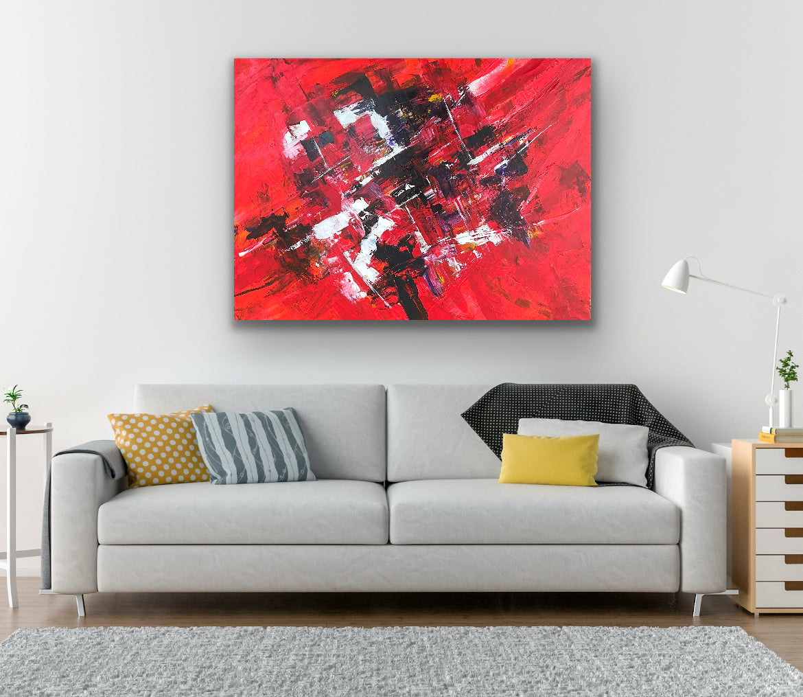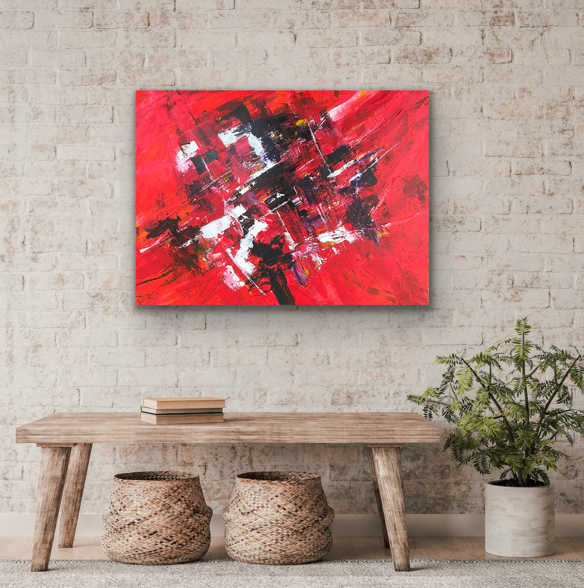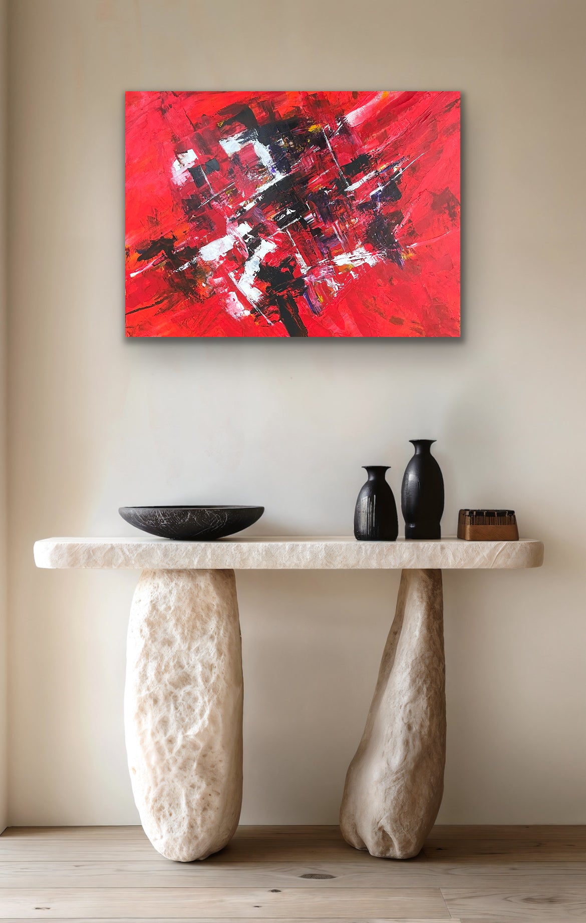 Measuring an impressive 48" x 36" x 1.5", this striking abstract painting embodies a powerful aesthetic, masterfully merging colors, lines, and patterns in a mesmerizing visual symphony. The bold color palette, dominated by shades of red, black, and white, invites viewers to delve into a realm of striking contrasts and graceful fluidity.