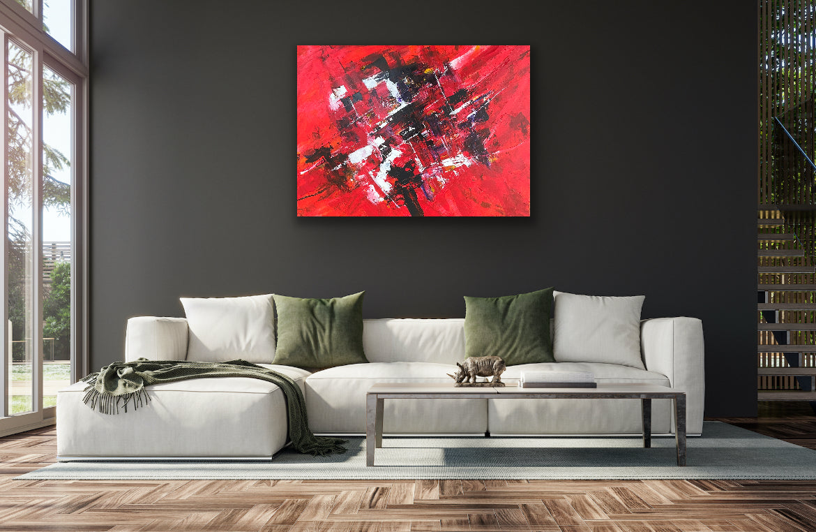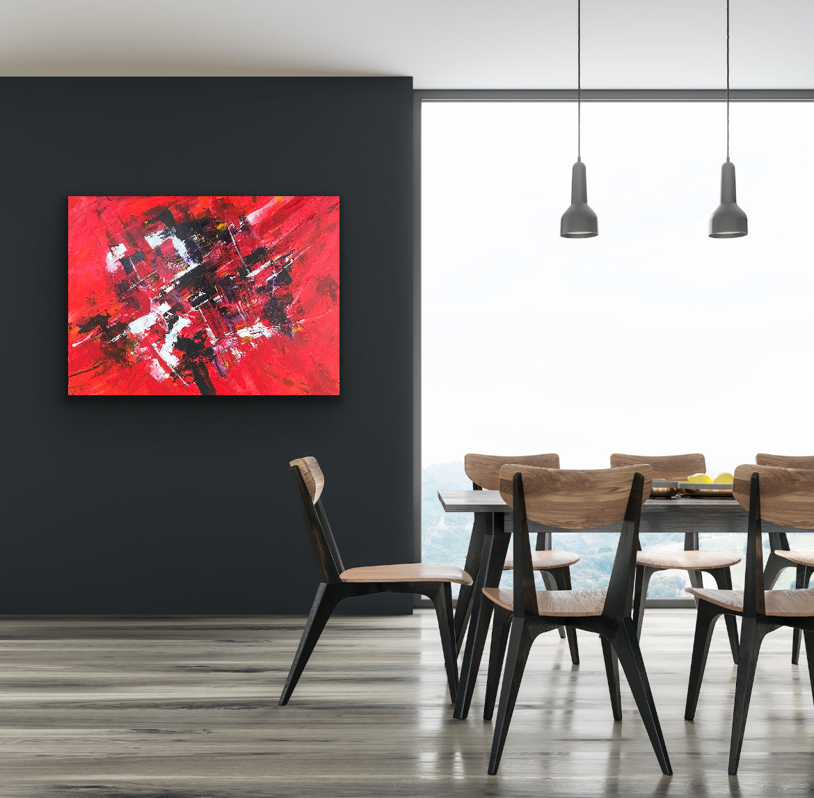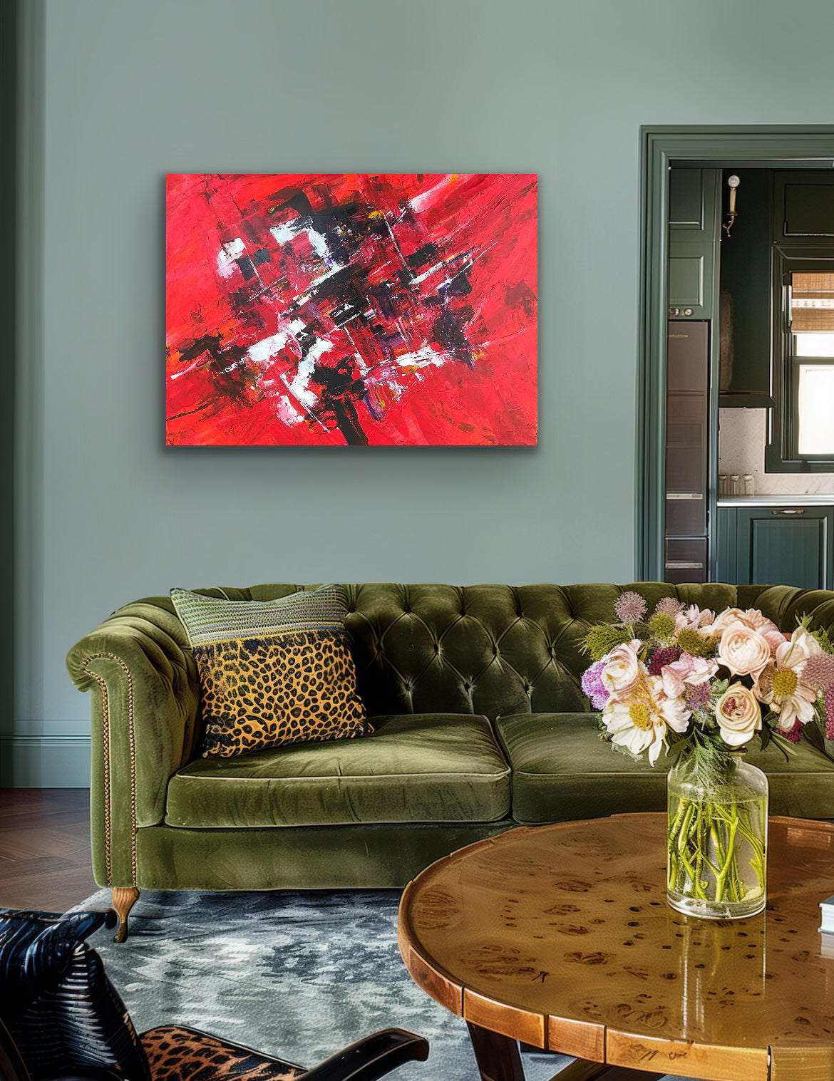 Measuring an impressive 48" x 36" x 1.5", this striking abstract painting embodies a powerful aesthetic, masterfully merging colors, lines, and patterns in a mesmerizing visual symphony. The bold color palette, dominated by shades of red, black, and white, invites viewers to delve into a realm of striking contrasts and graceful fluidity.