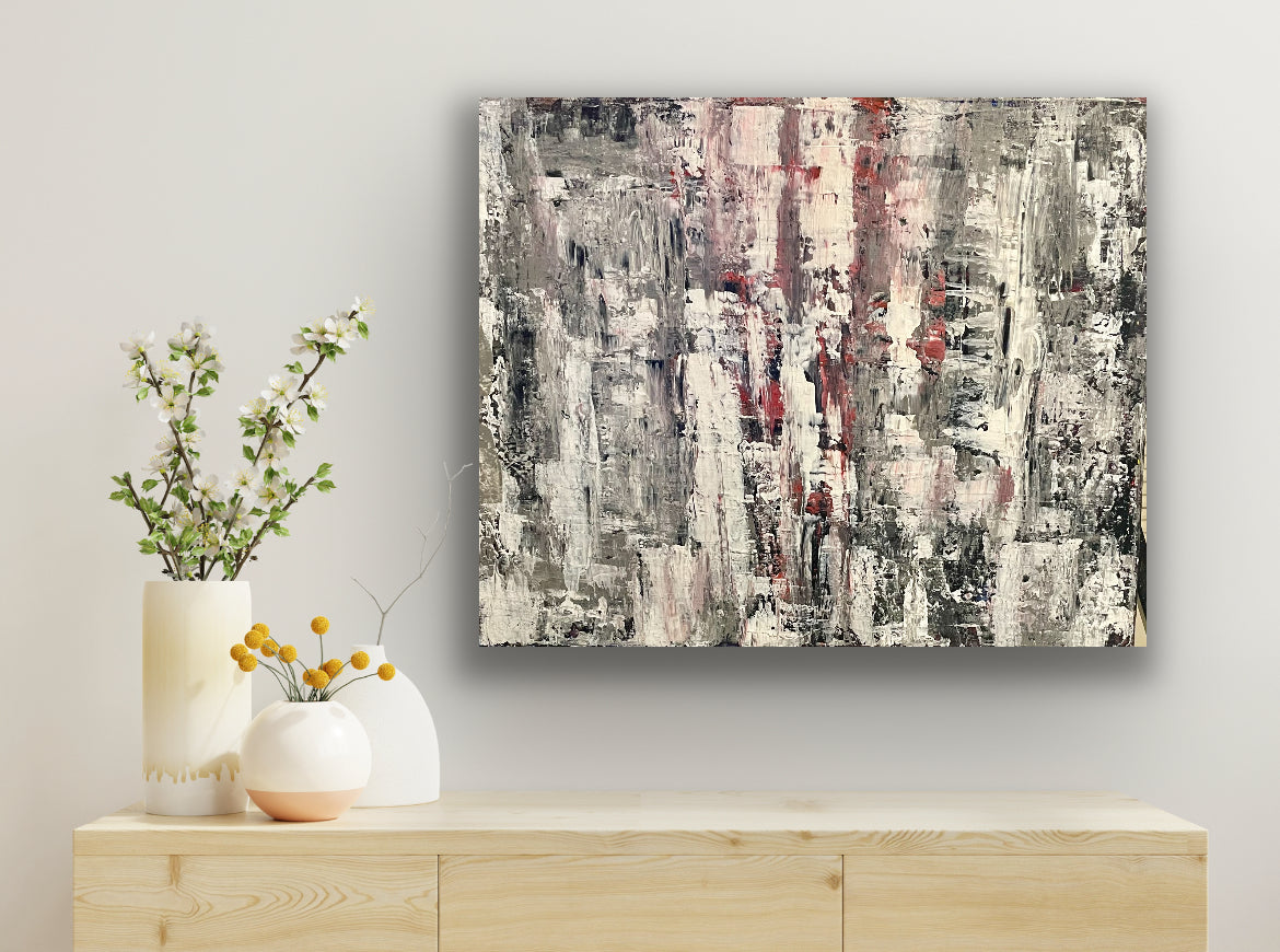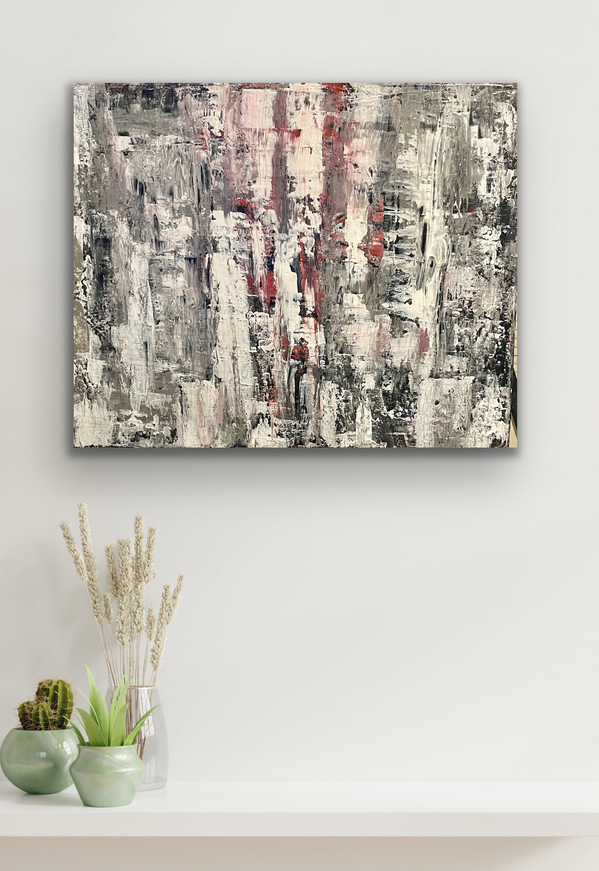 This is a Tony Hammer abstract acrylic painting for your home or office. This piece has a power descending design aesthetic. The colors streak and overlap, while also being contrasted by subtle color shifts, lines and patterns. The accents of black, grey, white and magenta is both subtle and striking. Fragments of neutral and bright colors streak and breeze across the surface creating a unique overall piece. It is truly an abstract painting like no other that will enhance your space.