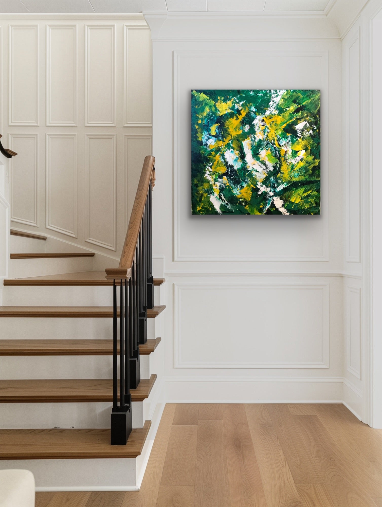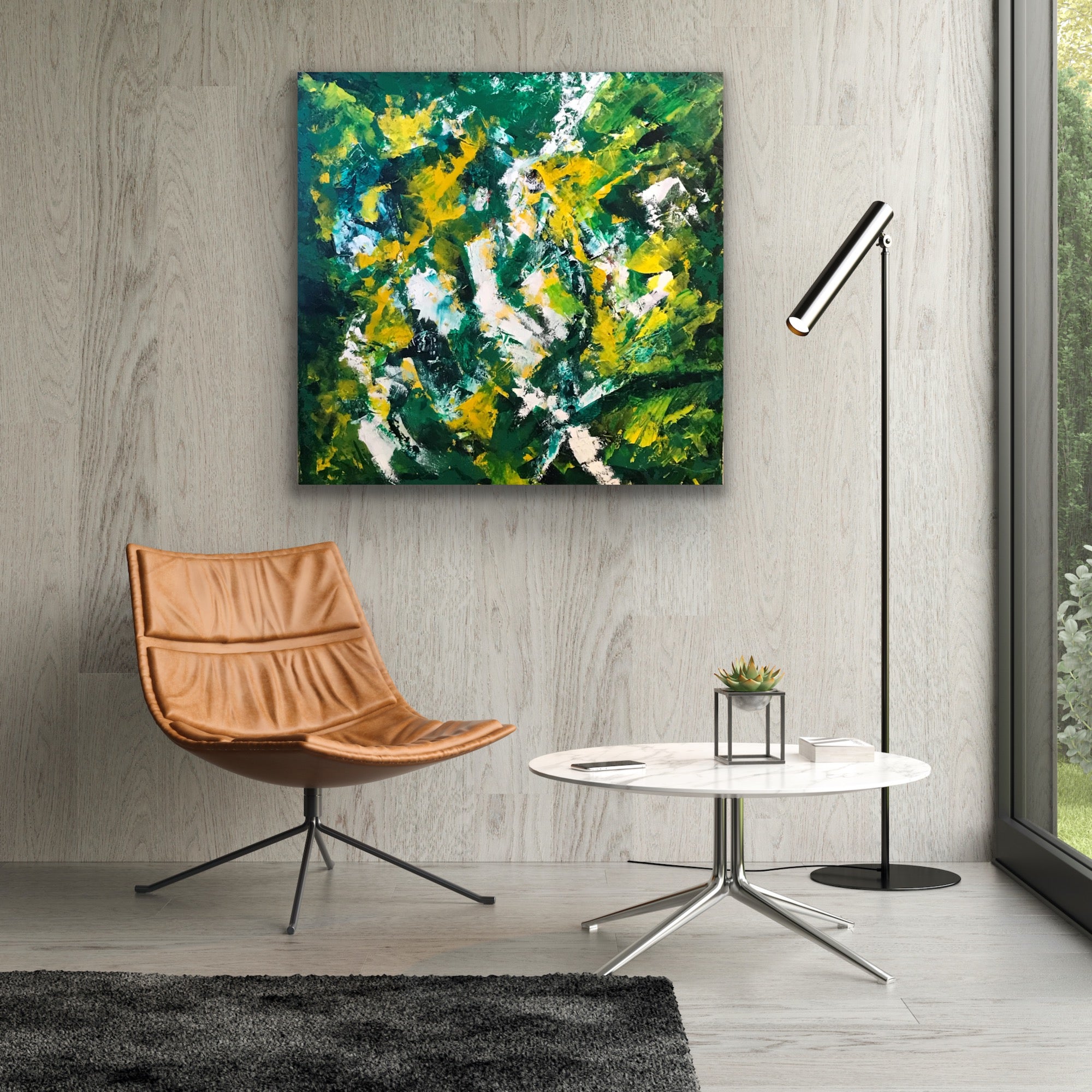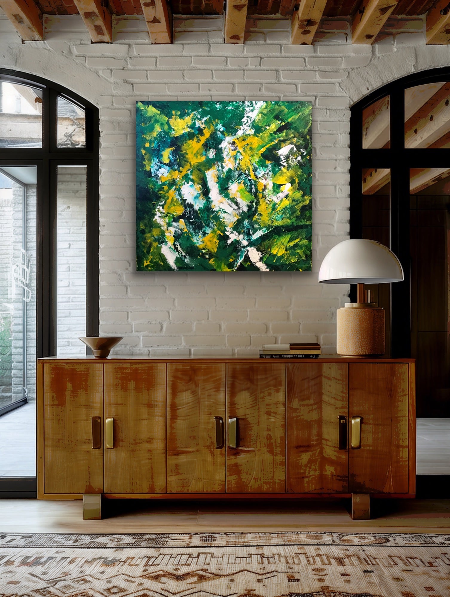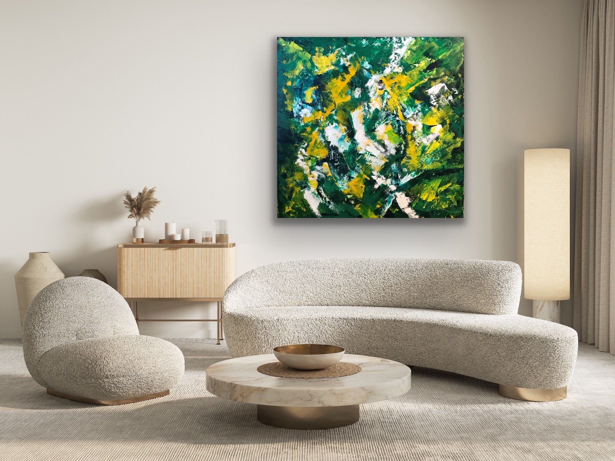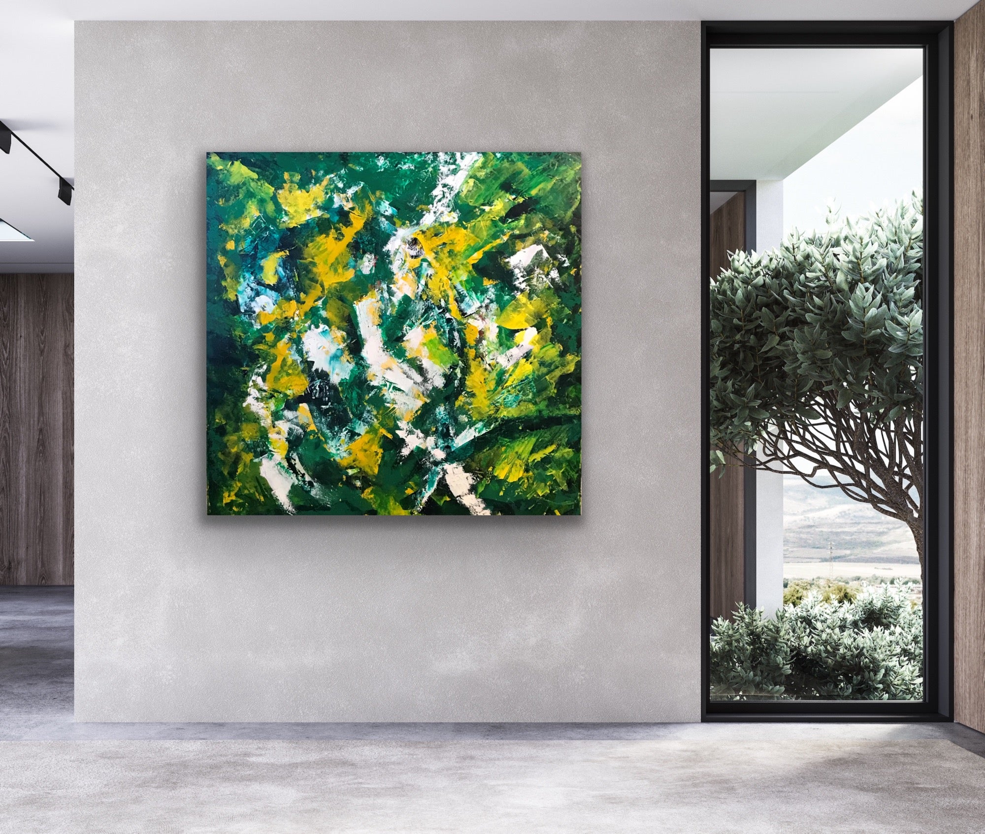 Drawing inspiration from the Abstract and non-figurative art movements, Tony Hammer's creation is a symphony of movement and contrast. Bold streaks of vivid green, sunshine yellow, and crisp white dance across the canvas, blending seamlessly with fragments of neutral and vibrant hues. Subtle patterns, lines, and color shifts intertwine throughout the composition, inviting viewers to lose themselves in its mesmerizing design.