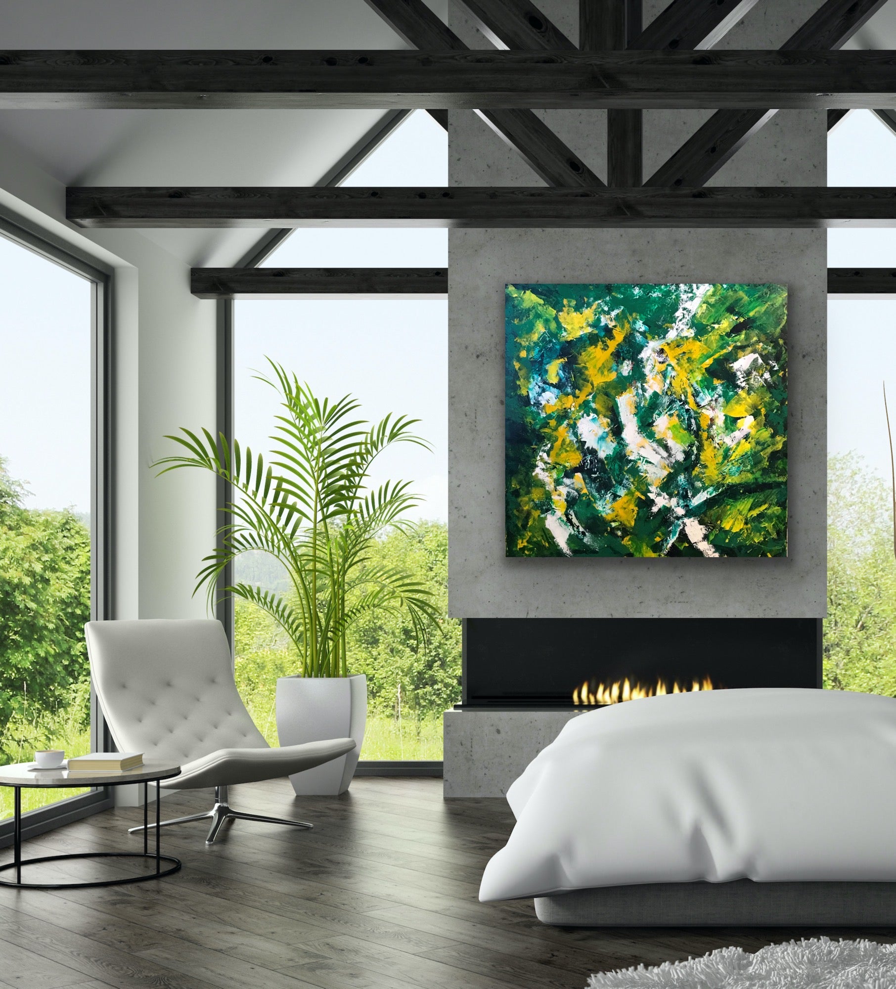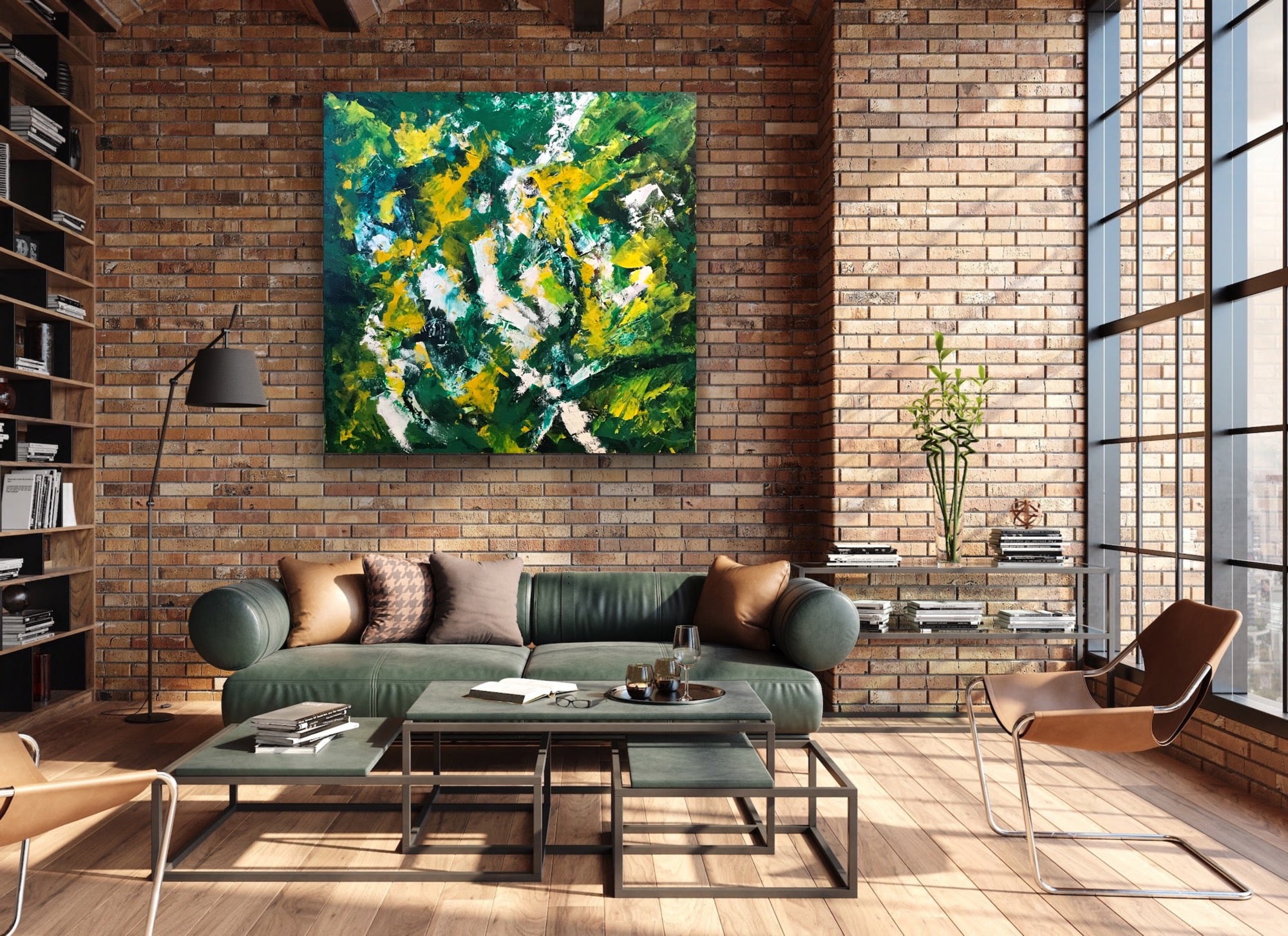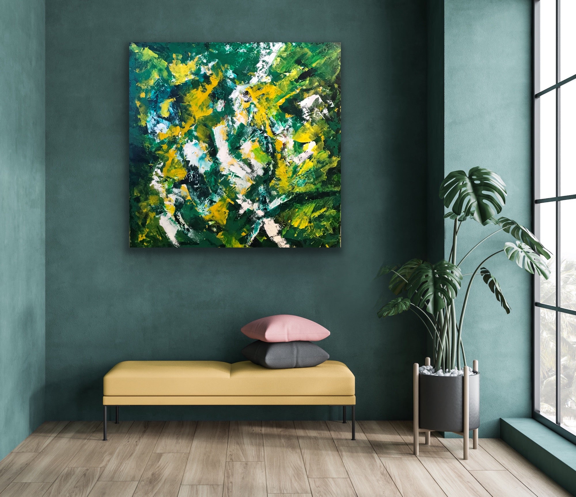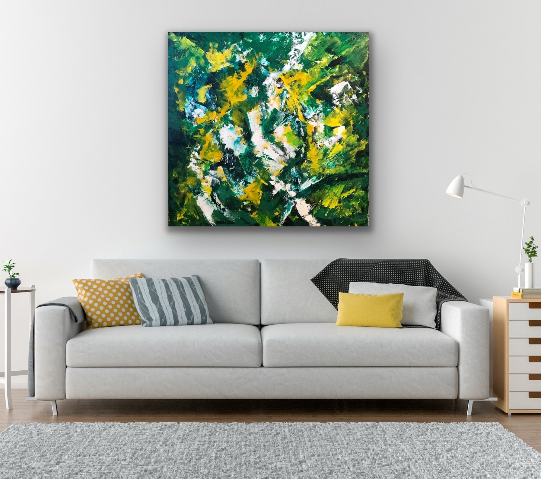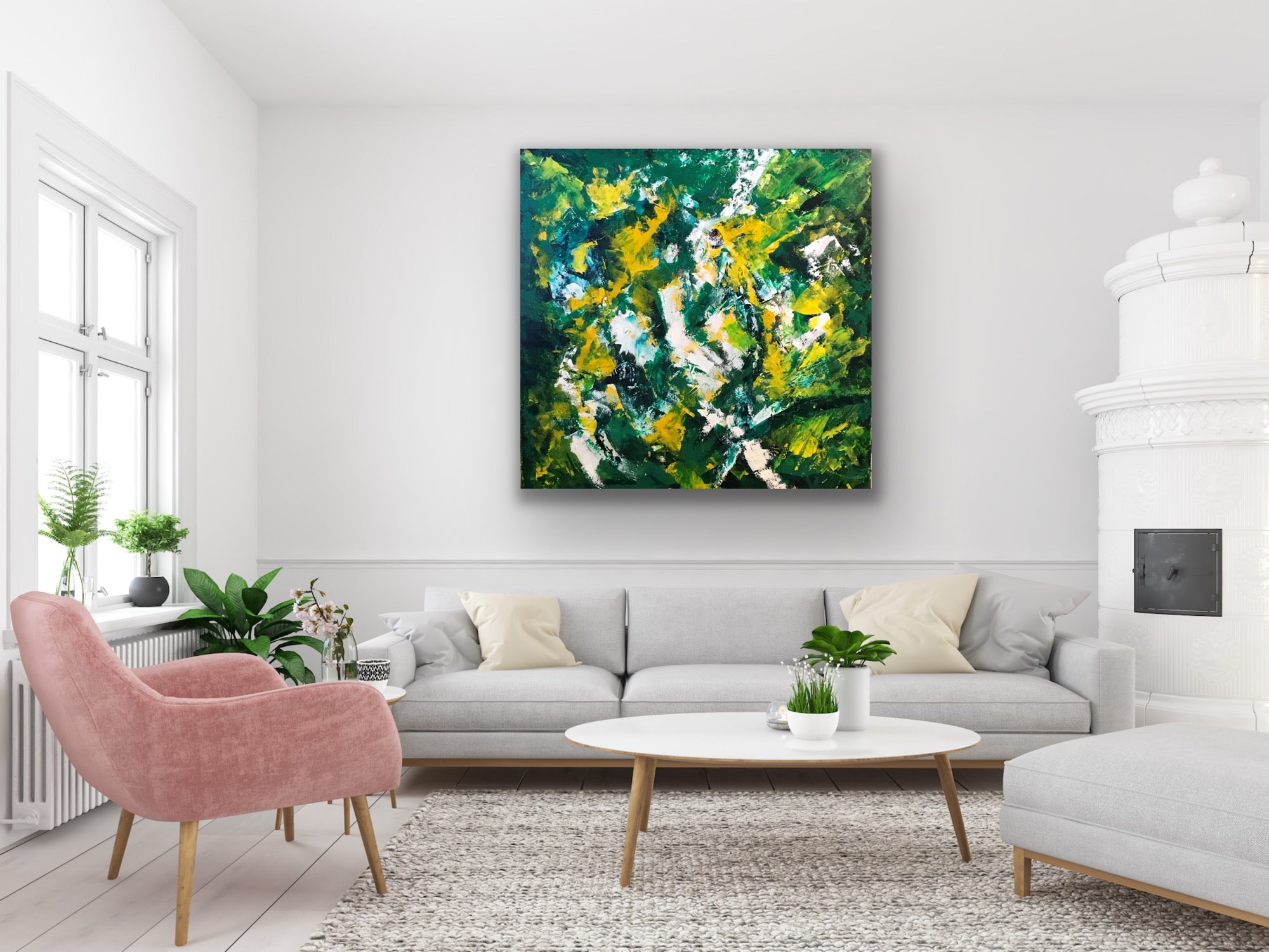 Drawing inspiration from the Abstract and non-figurative art movements, Tony Hammer's creation is a symphony of movement and contrast. Bold streaks of vivid green, sunshine yellow, and crisp white dance across the canvas, blending seamlessly with fragments of neutral and vibrant hues. Subtle patterns, lines, and color shifts intertwine throughout the composition, inviting viewers to lose themselves in its mesmerizing design.